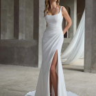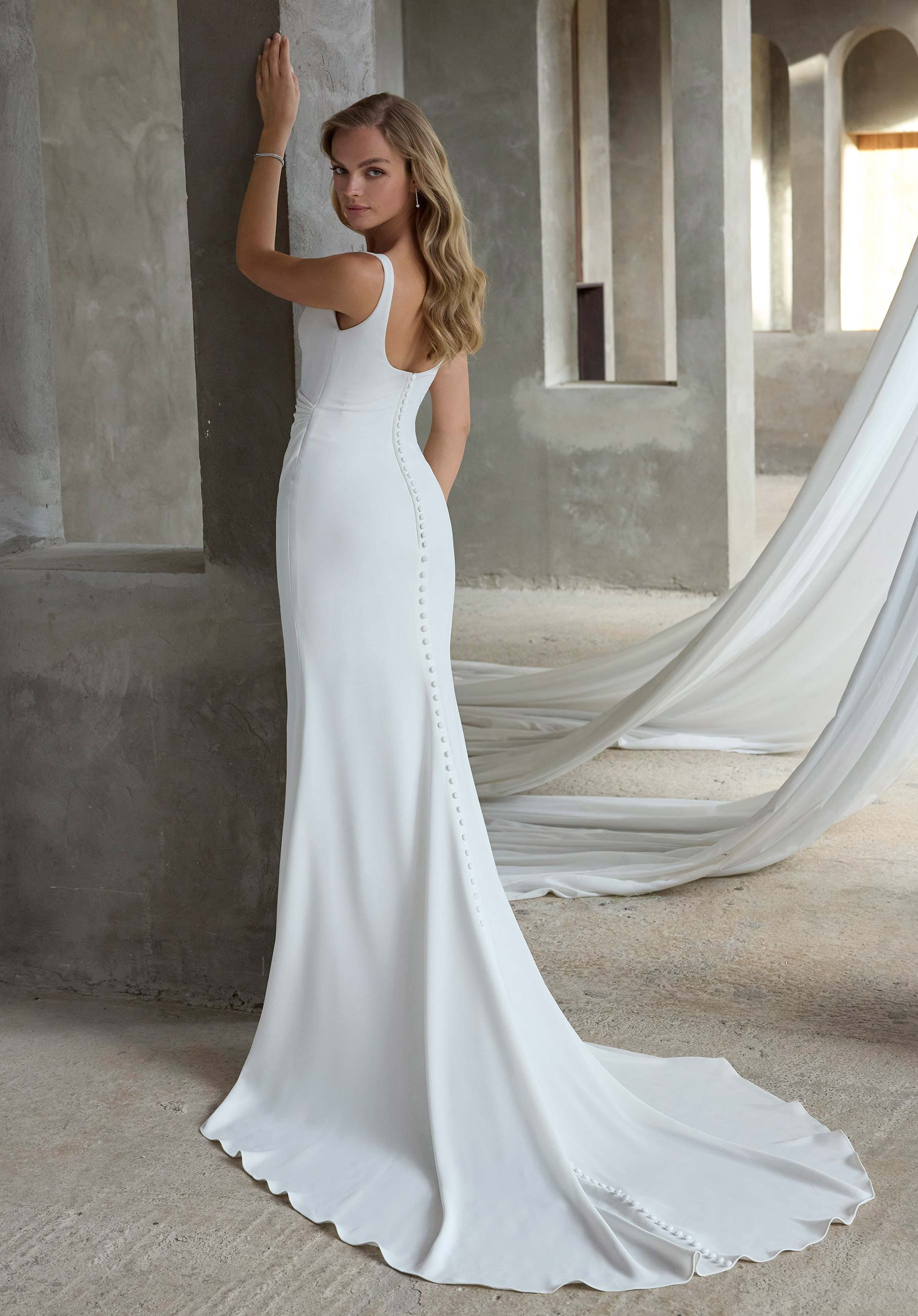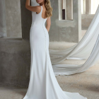 Vestido de novia minimalista confeccionado en crepe, con drapeado en vientre y escotes cuadrados.